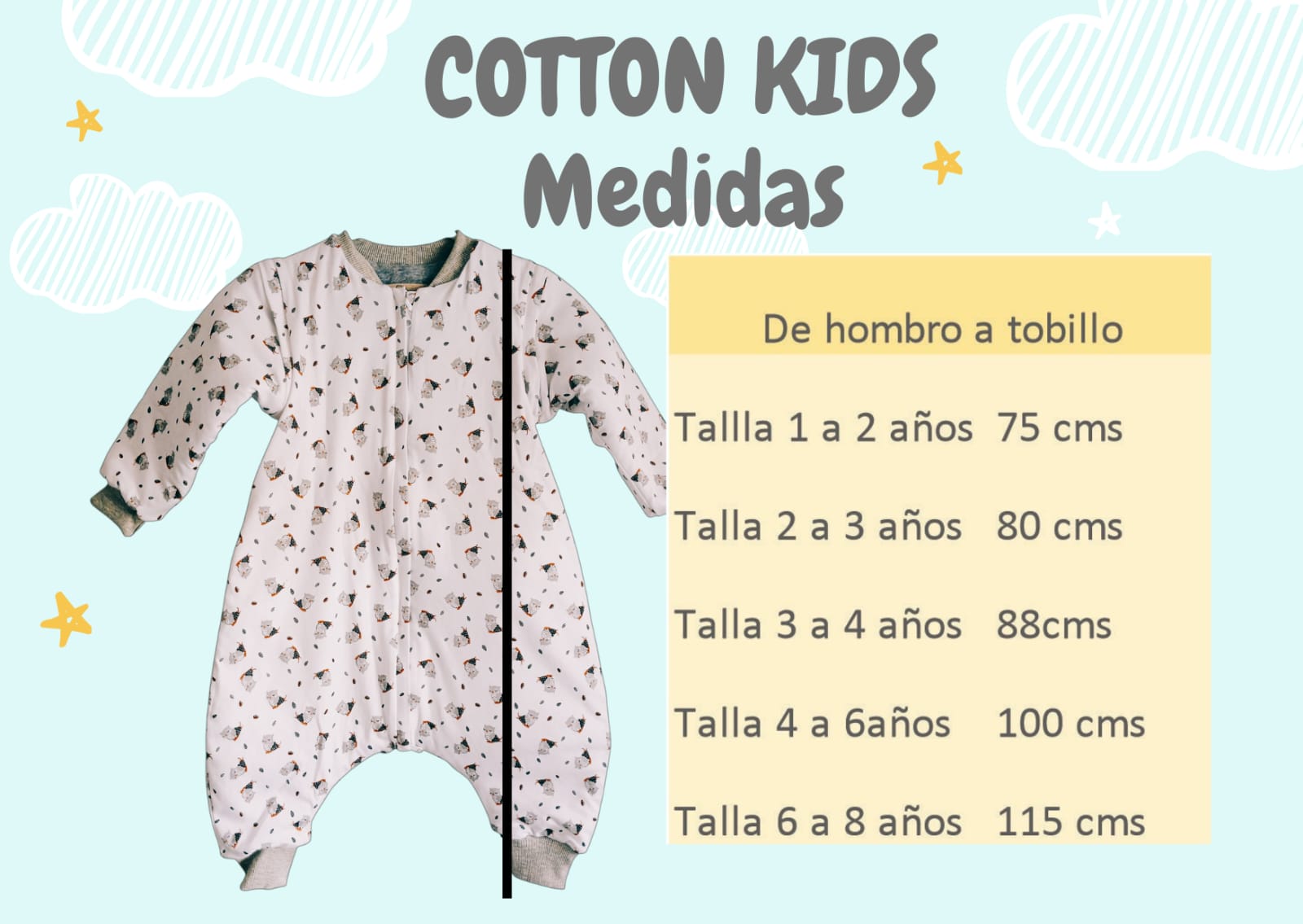 • Los saquitos de dormir son de algodón pima con fibra térmica 3m y forro de algodón